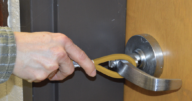 Loop the end without the spring latch around door handle until it meets the handle shaft.